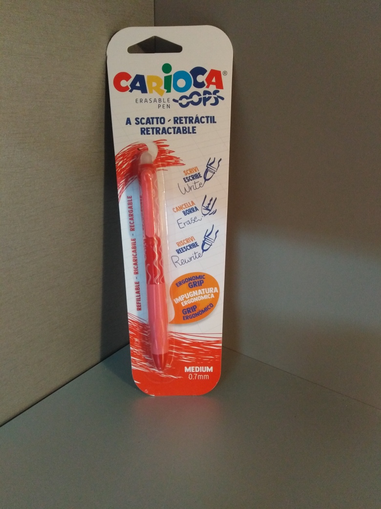 Esferográfica de tinta apagável da Carioca, ponta Preto fino (0,7mm), modelo Oops.